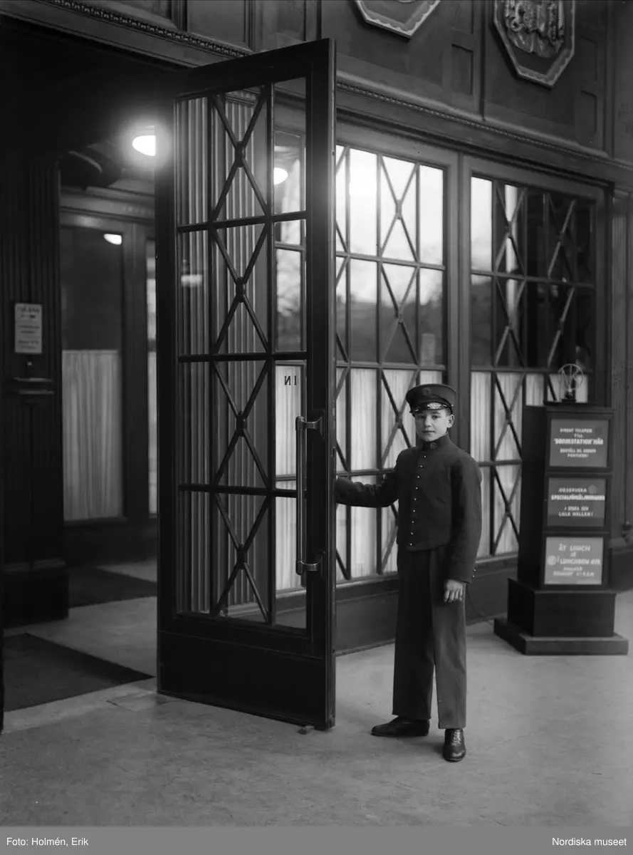 Dörrvakt. Pojke i NK-uniform håller upp dörr.