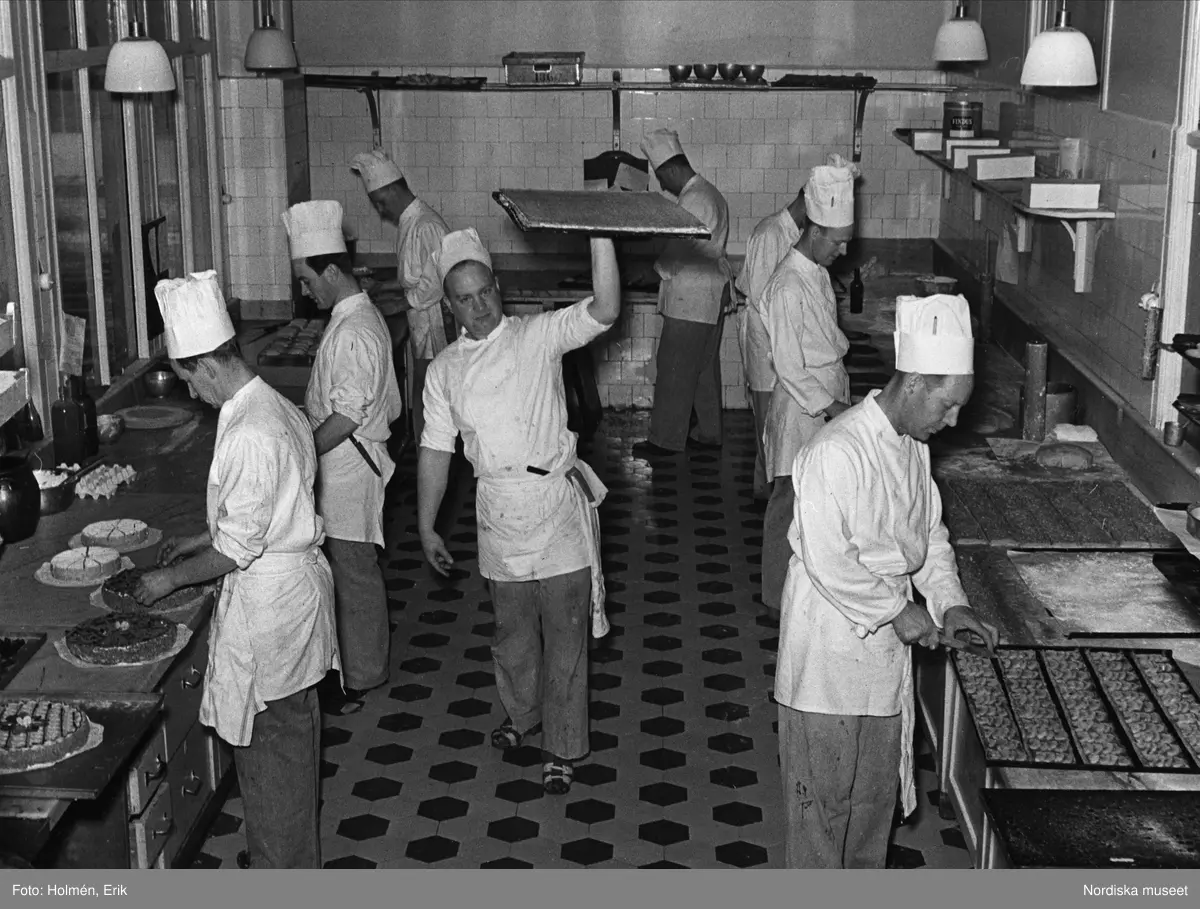 Interiör från köket på konditoriet i Nordiska Kompaniet. En grupp bagare i arbete. Några dekorerar tårtor, andra skär bröd på plåtar. 7 maj 1947.