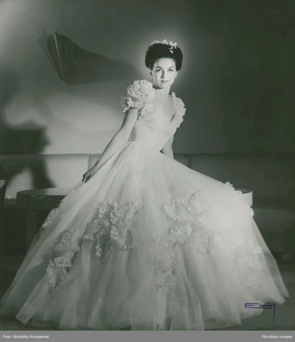 Modebild för Nordiska Kompaniet 1945. Modellen och skådespelerskan Hjördis Genberg Niven i vit aftonklänning med spets från NK:s franska.