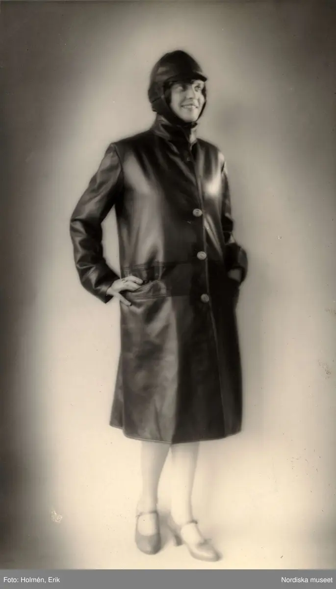 "Bilekipering. Kvinna iklädd "en tip top bilrock av bordeauxfärgat getskinn med klarröda stickningar", huvudbonad och pumps. Nordiska Kompaniet.