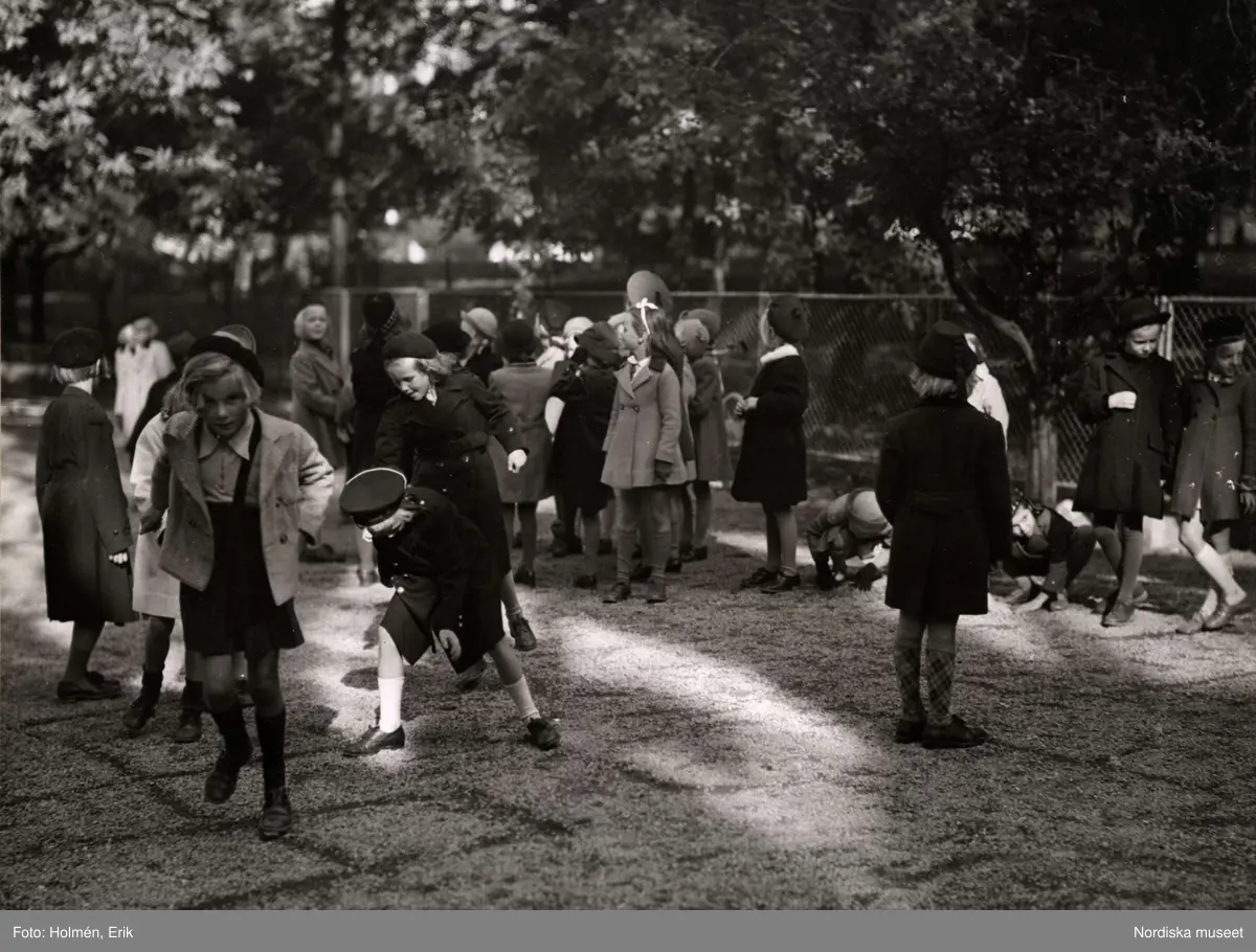 Reklam för skolkläder, Nordiska Kompaniet, 1941. Några flickor hoppar hage på skolgården.