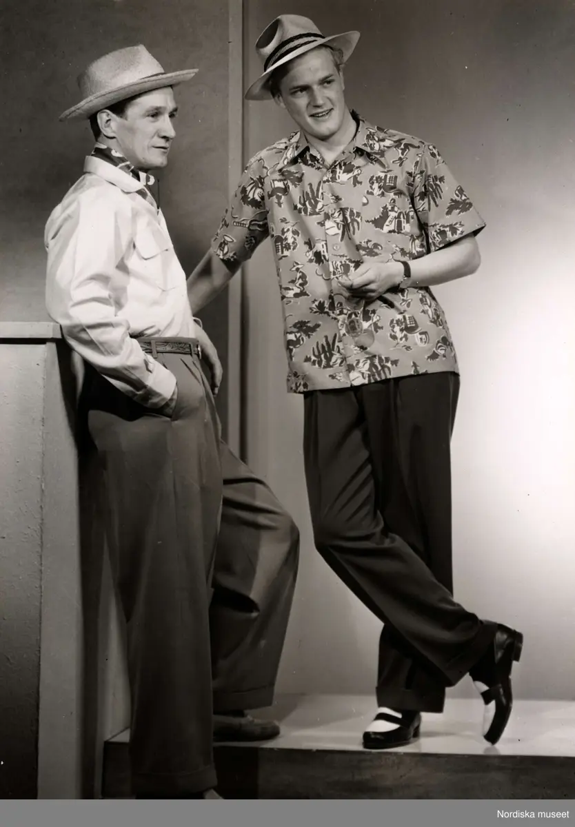 Två manliga modeller visar California - kläder på varuhuset Nordiska Kompaniet i Stockholm 1947. De är ledigt klädda, den ene poserar i vida byxor, långärmad skjorta, plastrong och hatt. Den andre bär kortärmad, mönstrad skjorta, vida byxor, hatt och tvåfärgade loafers.