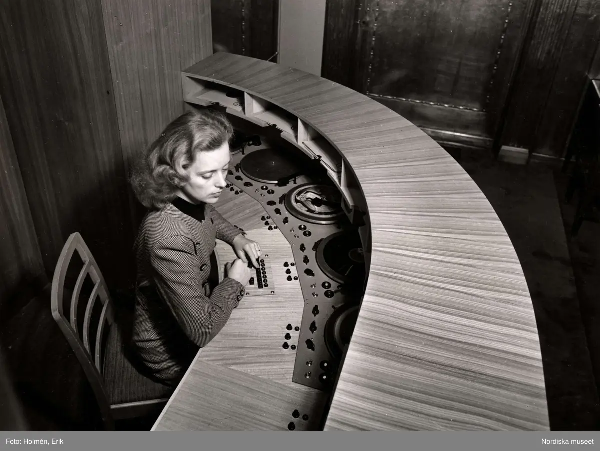 Grammofonavdelningen vid varuhuset Nordiska Kompaniet i Stockholm 1947. En ung kvinna i tweeddräkt sitter vid ett svängt mixerbord av trä. Framför henne flera stycken skivspelare, knappar och reglage. Hon trycker på en knapp.
