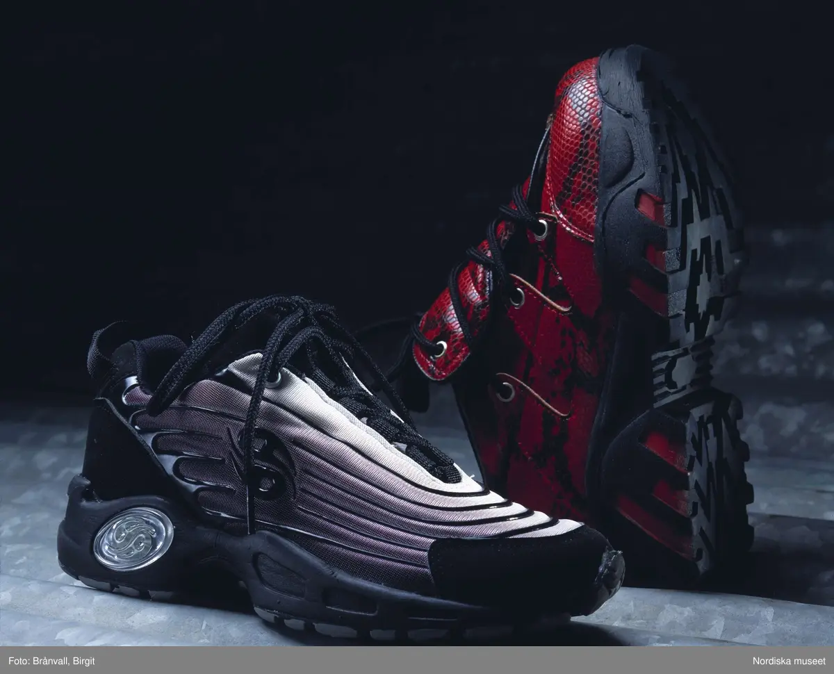 Sportskor. Grå sko från Dockers och röd sko från Lipstick, hösten 2000.