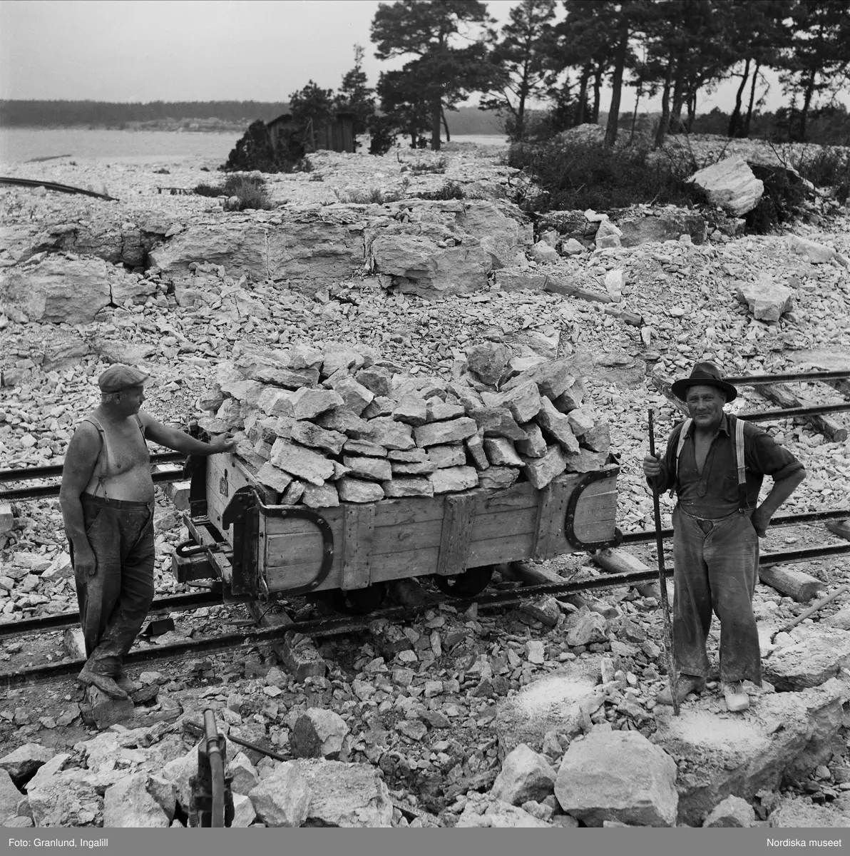 Hellvi socken, Hide, Gotland. Arbete i kalkbrottet i Hide. Två män står vid en vagn, på räls, som lastats med sten.