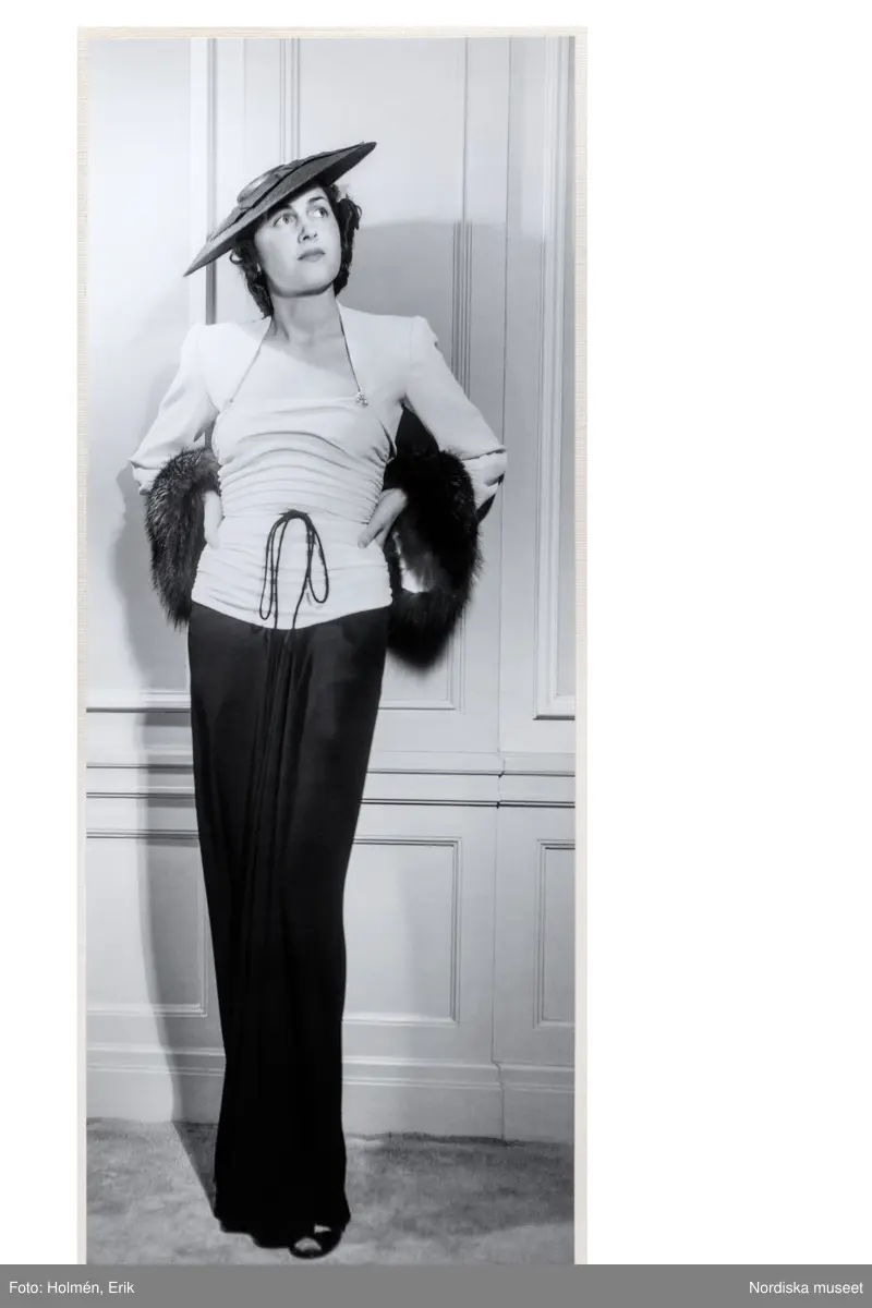 Mannekäng visar festklänning i svart och vitt med rynkat liv med tunn snodd i midjan. Matchande bolero med pälsdetaljer. Hatt. NK:s Franska damskrädderivåren 1938.
