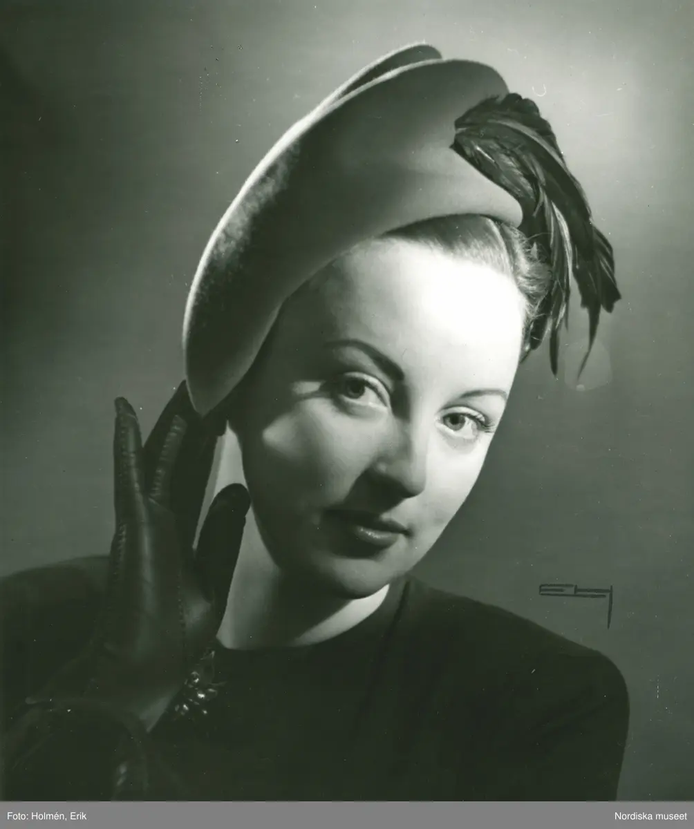 Porträtt av kvinnlig modell, möjligen Hjördis Grundel-Starenius, med hatt i röd filt med svart fjäder. Uppvisning Nordiska kompaniet mars 1947. Hattar använda vid franska avdelningen.