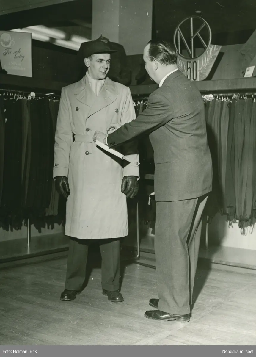 En man provar trenchcoat på Nordiska Kompaniets herrkonfektionsavdelning.