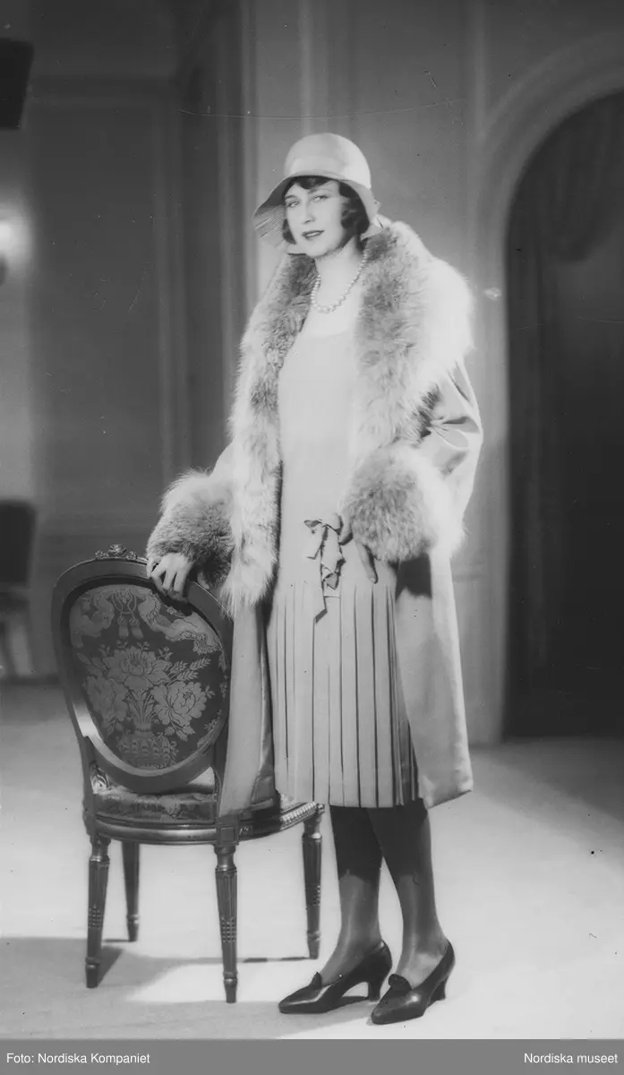Modell i klänning, veckad nedtill, kappa med krage och ärmslut i päls, klockhatt och pumps, vid en stol.