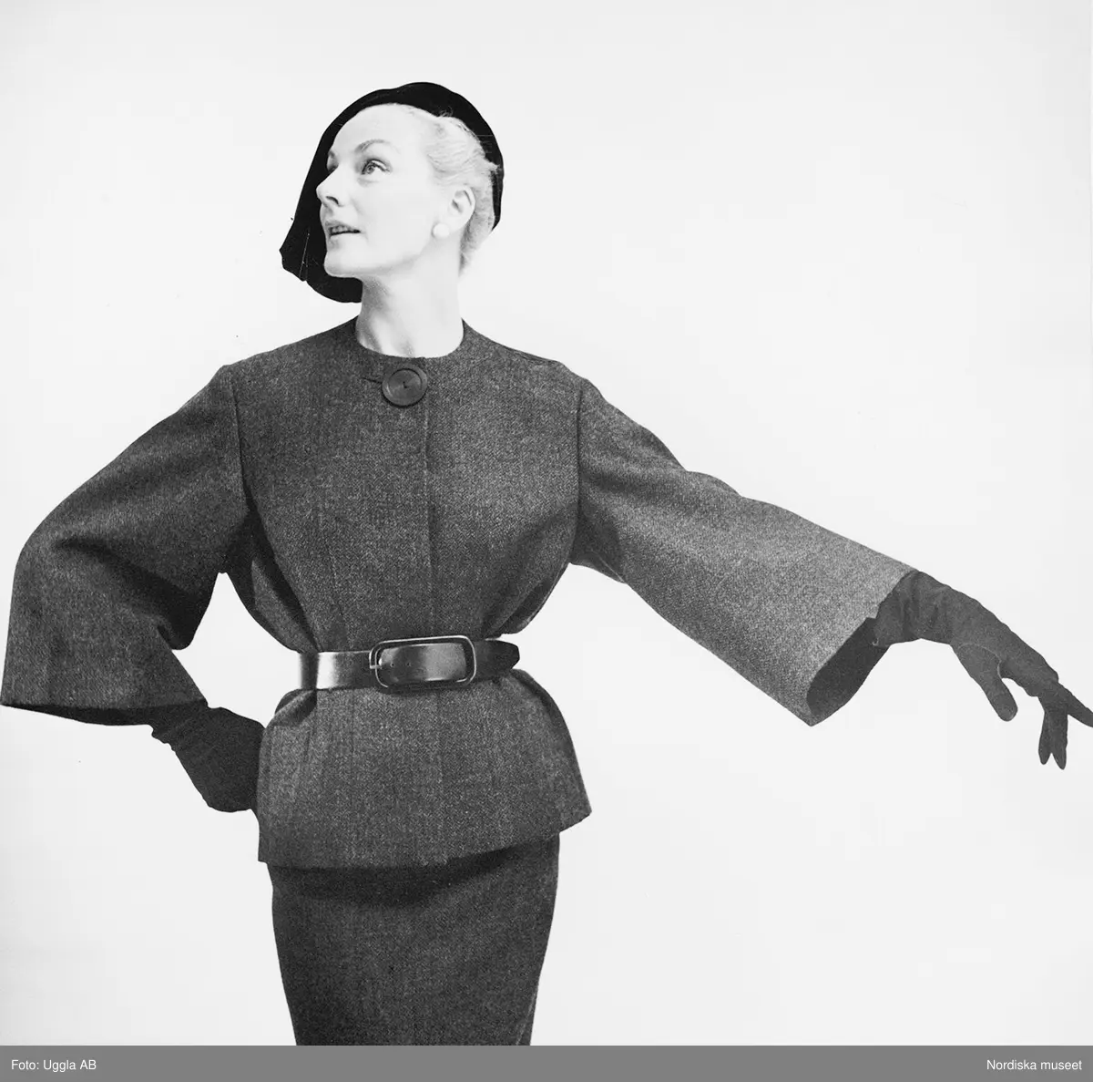 Mannekäng i svart/grå dräkt med skärp, handskar och hatt. Original Balmain, NK:s Franska damskrädderi.