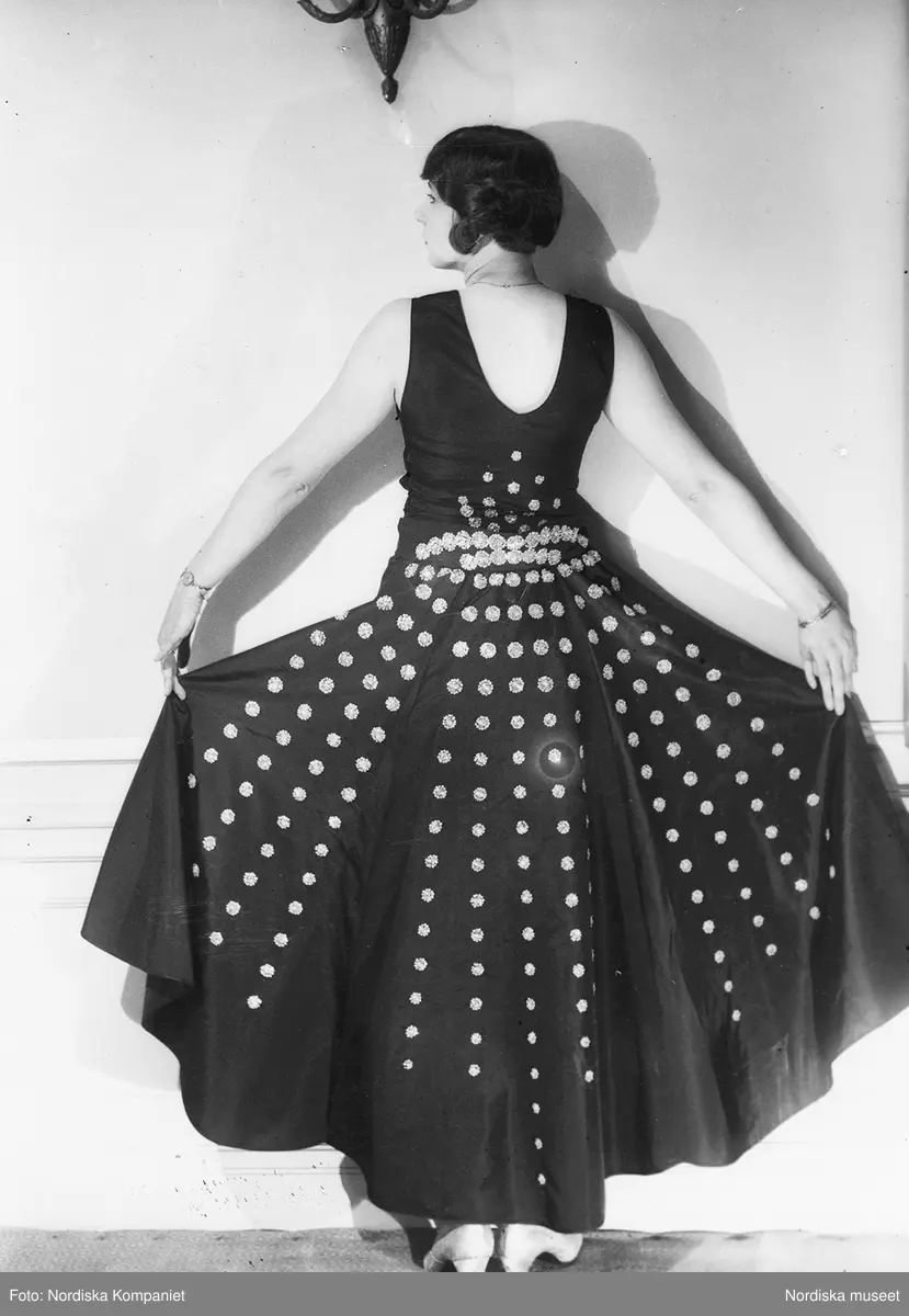 Mannekäng med ryggen mot kameran, klädd i svart långklänning i faille med strassbroderi. Från Jeanne Lanvin, NK:s Franska damskrädderi, hösten 1928.