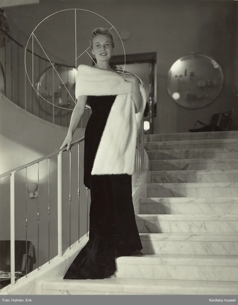 Nordiska Kompaniet. Kvinna i mörk aftonklänning och vit minkstola.