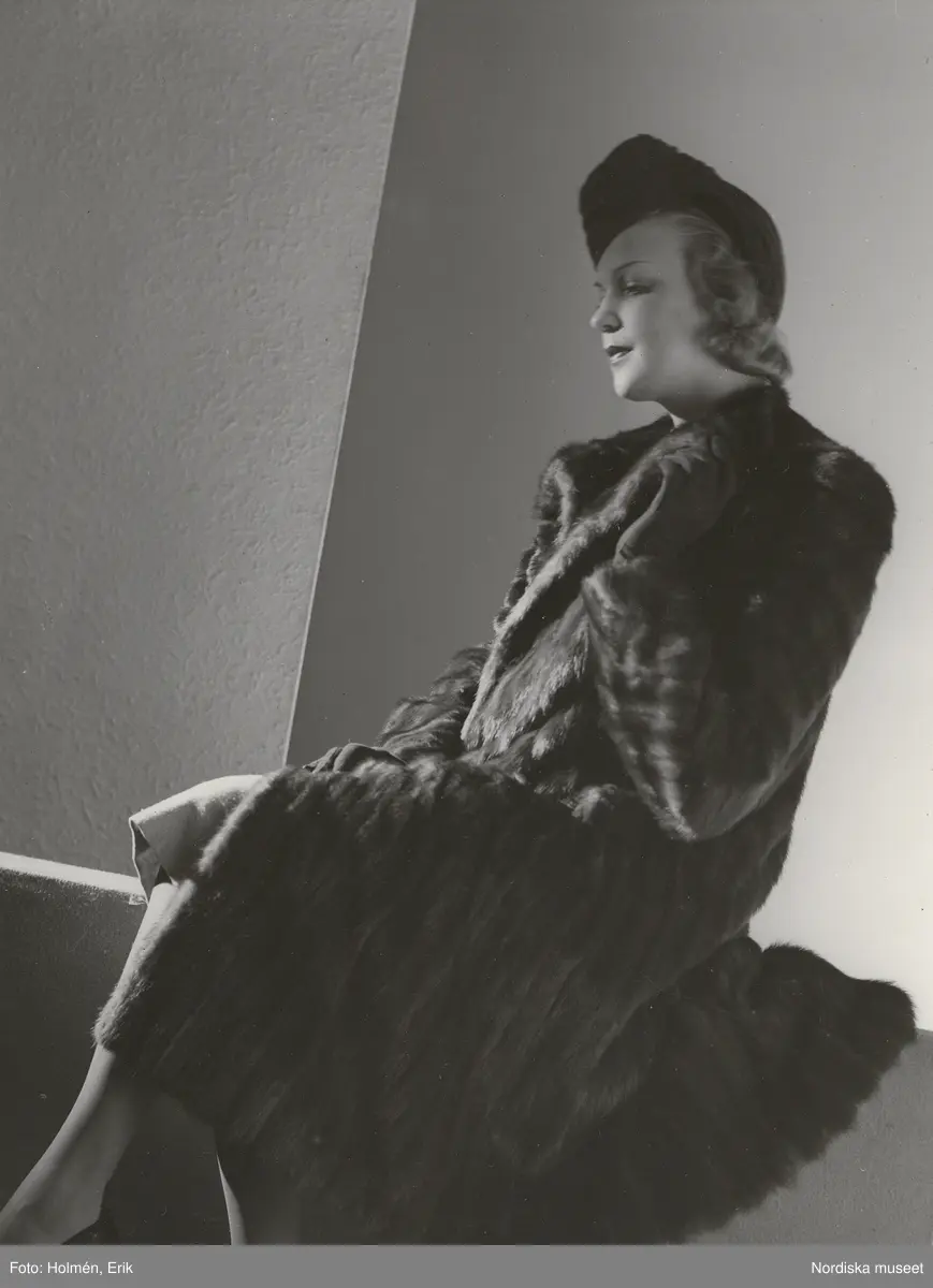 Nordiska Kompaniet. Kvinna i mörk minkpäls och hatt. Text på baksidan: "Pälsar 1942 (fru Margit Langlet)".