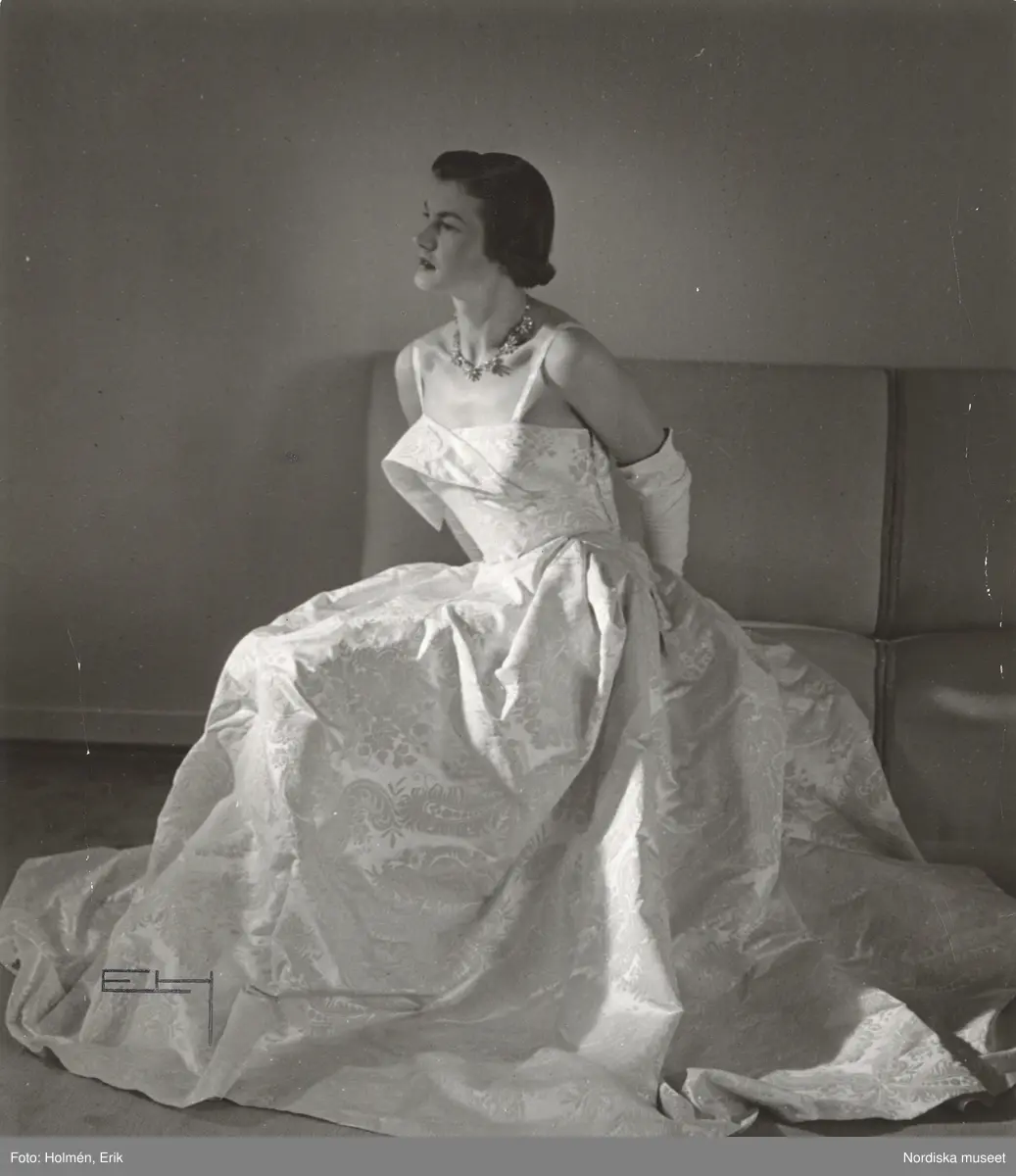 Nordiska Kompaniet. Kvinna i ljus, mönstrad aftonklänning med smala axelband. Omlottdraperin vid bysten. Text på baksidan: "Hösten -49 N.K."