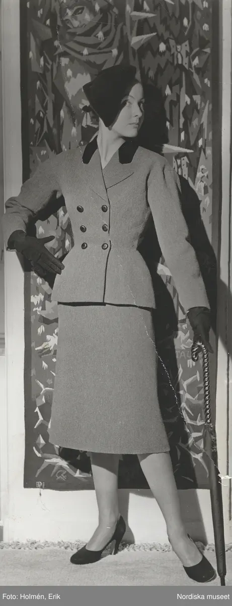 Modell i dräkt, hatt, handskar och paraply i handen, framför textilkonstverk.