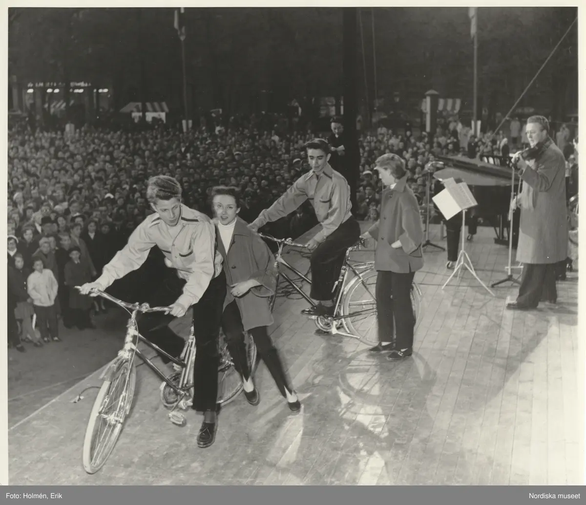 Tonårsmode visas i Kungsträdgården i Stockholm, Nordiska Kompaniet. Två unga män och två unga kvinnor visar upp cyklar. Man spelar fiol i bakgrunden.