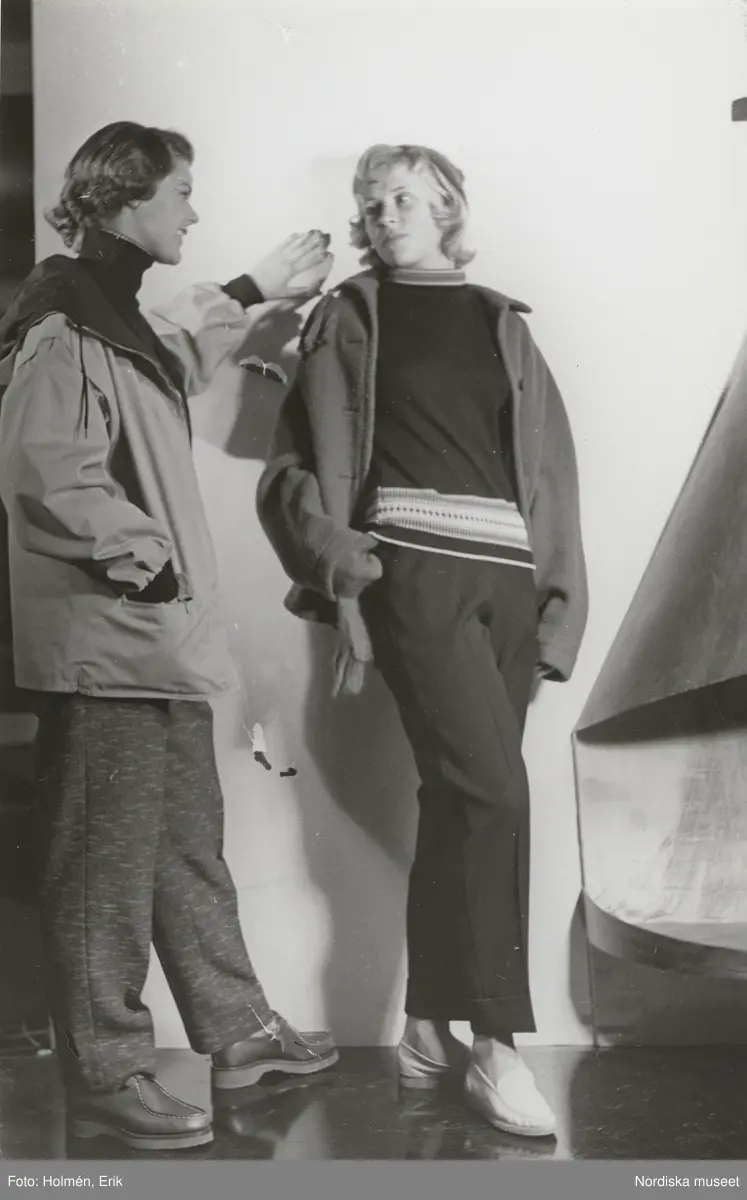 Tonårsmode. Två kvinnor i vinterjackor, polotröjor och byxor, lutar sig mot en vägg.