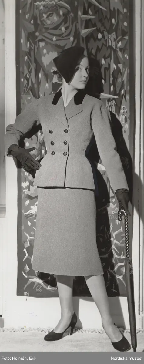 Modell i dräkt, hatt och pumps med paraply i handen. Textilkonstverk i bakgrunden. Från Balenciaga.
