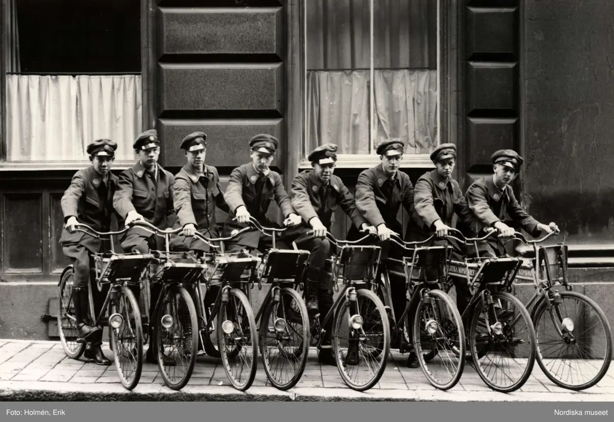 Nordiska Kompaniets cykelbud på rad. Unga pojkar som levererar varor med cykel till kunderna,