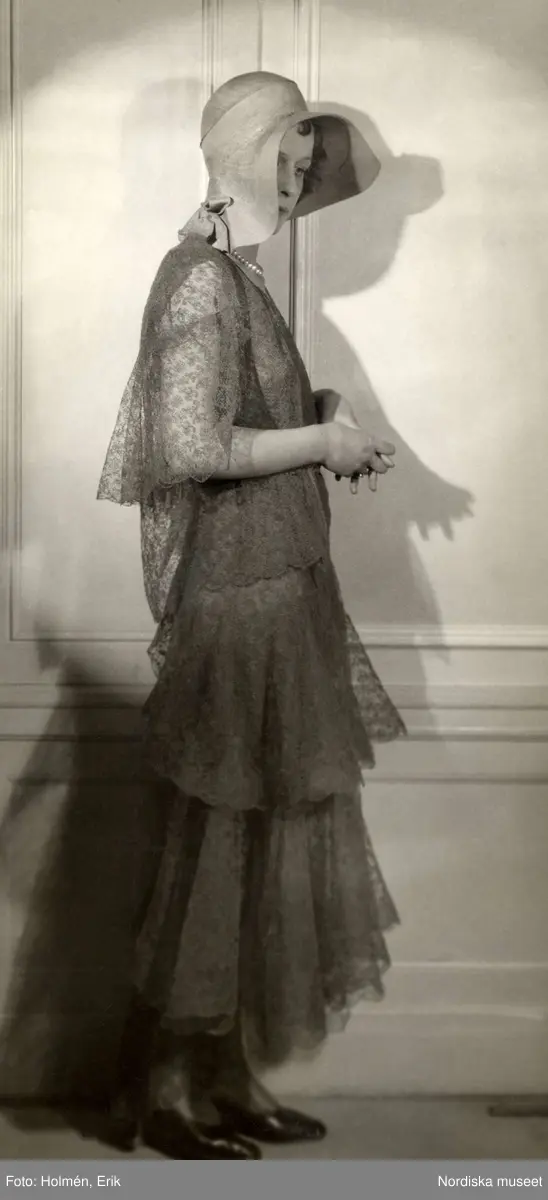 Klänning i olika längder, hatt med stort brätte. Nordiska Kompaniet.