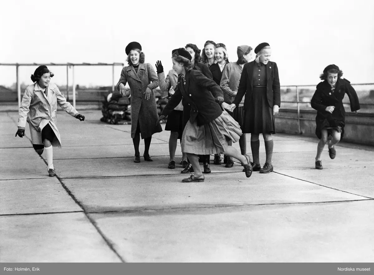 Skolungdom. Flickor leker på ett hustak.