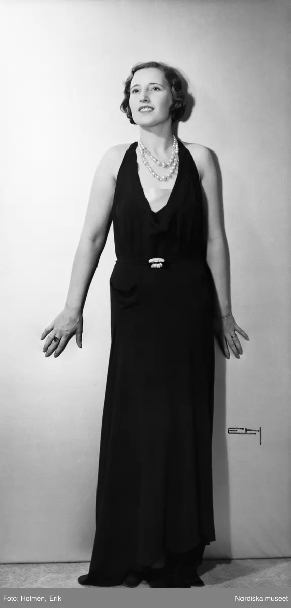Konfektion. Modell klädd i svart aftonklänning med halterneck och dubbelradigt pärlhalsband.