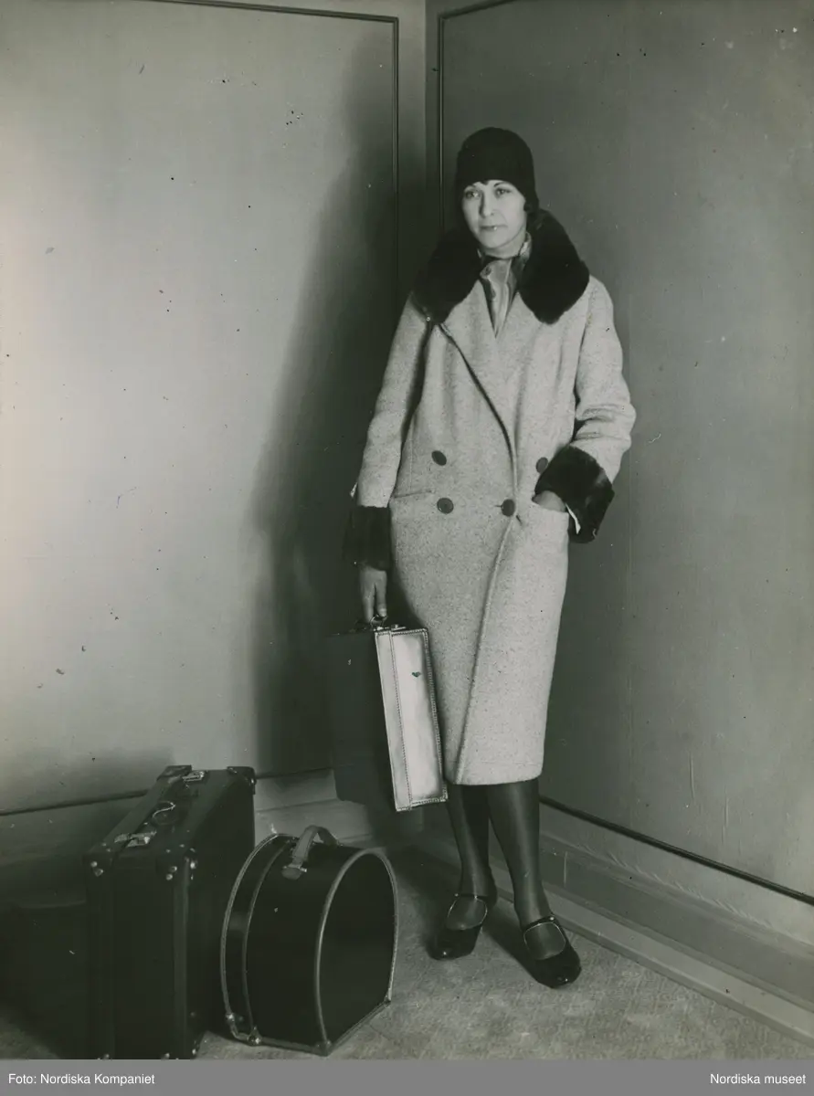 Reseffekter. Modell i kappa med dubbelknäppning med päls, klockhatt, sjal och resväska i handen. Två resväskor på golvet.