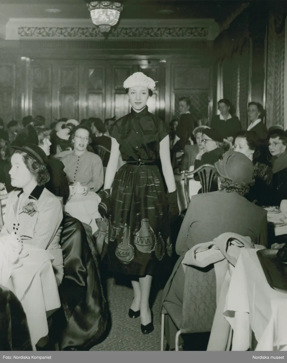 Modell i blus, kjol, hatt, handskar och pumps, modevisning på Nordiska Kompaniet.