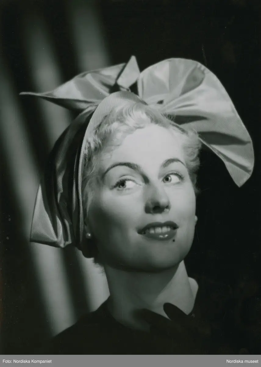 Porträtt av modell i hatt av skiftande taft i grönt och rosa, samt pärlörhängen. Av Claude S:t Cyr.