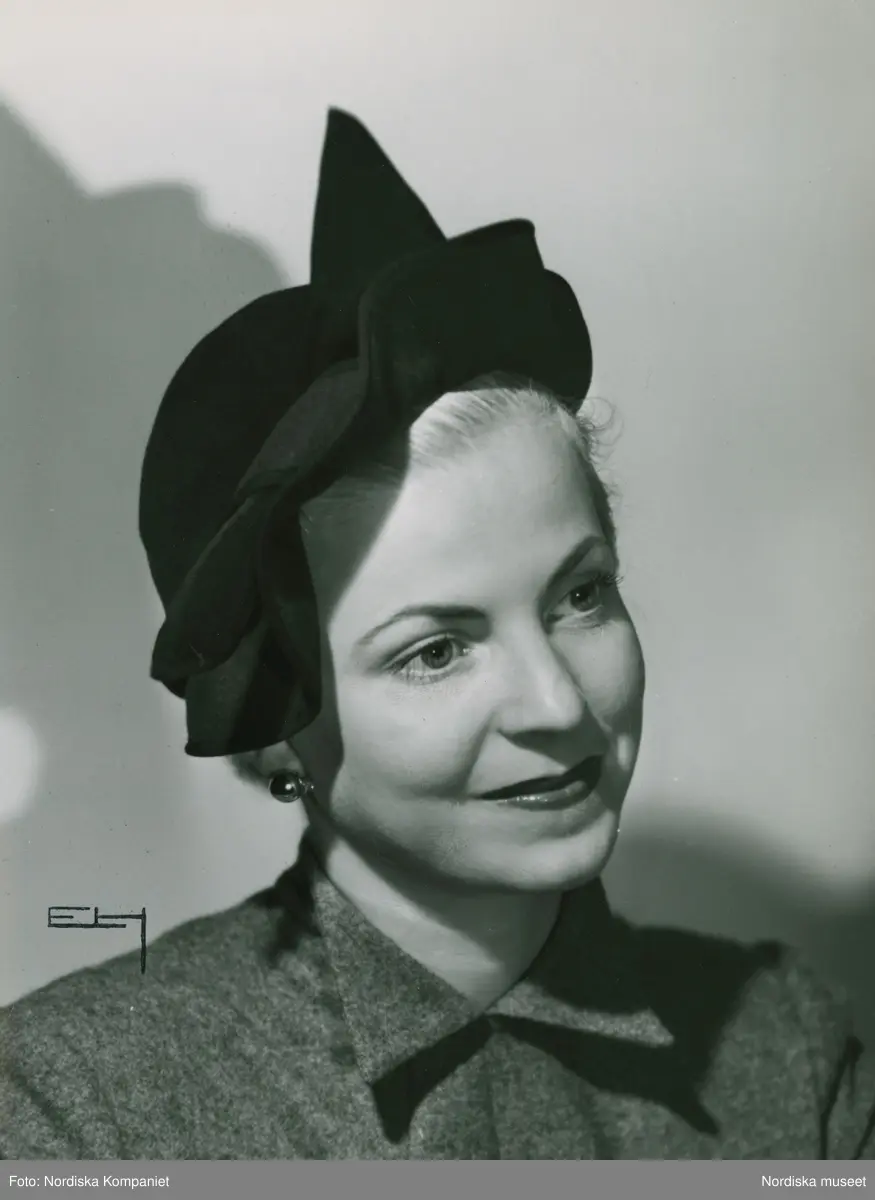 Porträtt av modell i royalblå velourhatt med svart bandkant, samt örhängen. Från M. Paulette, Paris.