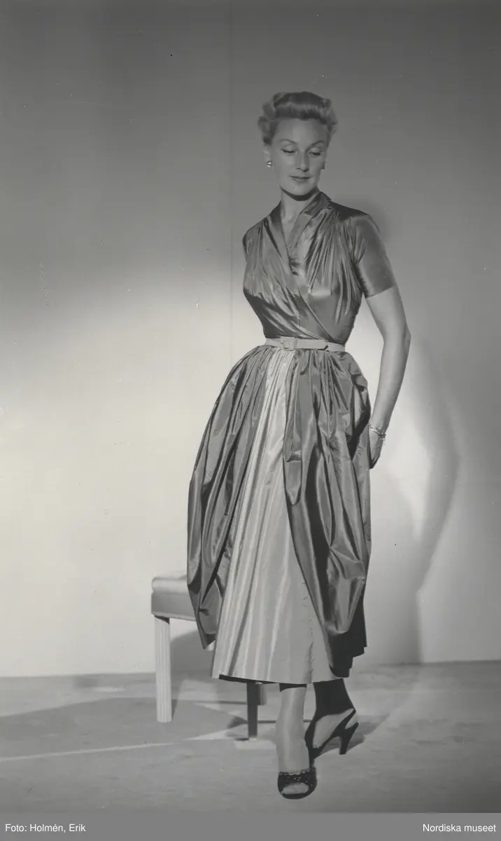 Modell i tvåfärgad sidenklänning med skärp. Från M. Grès.