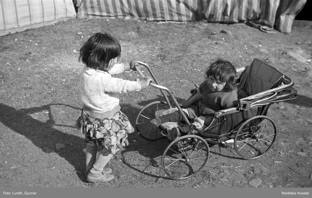 Liten flicka skjutsar en ännu mindre flicka i barnvagn. Familjen Taikons läger i Johanneshov, södra Stockholm.
