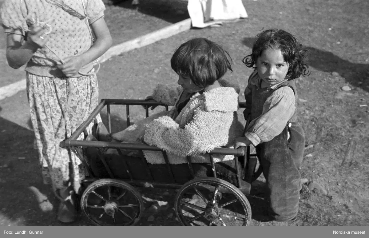 Tre barn leker med en vagn/skrinda. Familjen Taikons läger i Johanneshov, södra Stockholm.