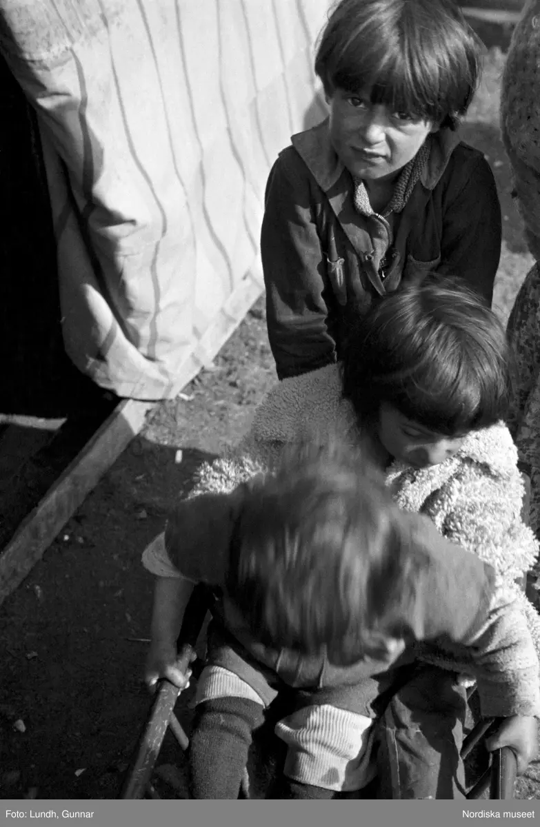 Tre barn leker med en skrinda. Två flickor sitter i vagnen medan en pojke står bakom och skjuter på. Familjen Taikons läger i Johanneshov, södra Stockholm.