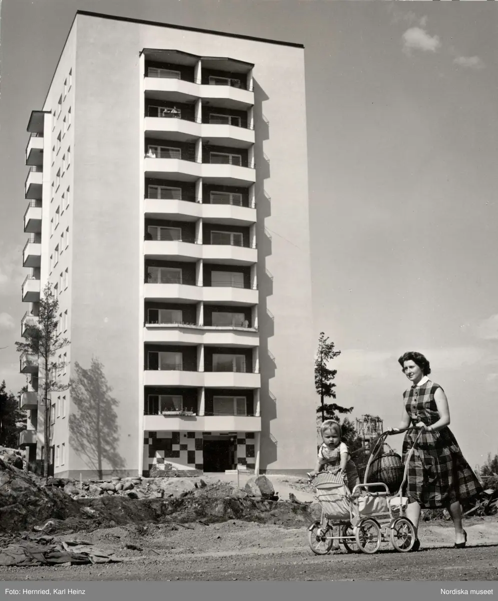 Kvinna med barnvagn promenerar framför nybyggt höghus i Stockholmsförorten Fruängen.
