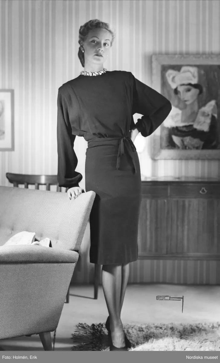 Modell visar en långärmad klänning. Nordiska Kompaniet.