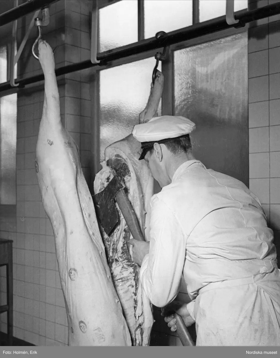 Slaktare styckar en gris. Nordiska Kompaniet.