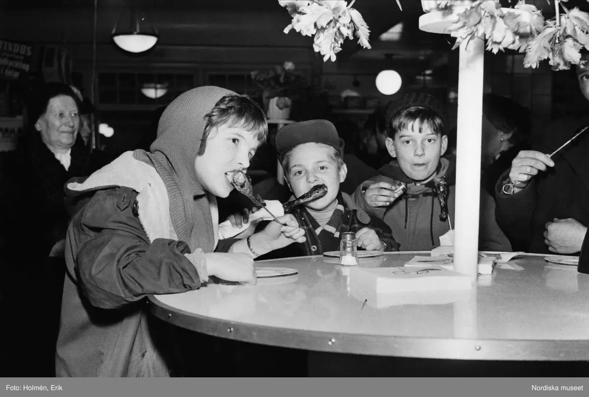 Barn som äter kycklingklubbor. Demonstration av Grillman, den elektriska bordsgrillen och Findus gödkyckling på varuhuset Nordiska Kompaniet 1956.