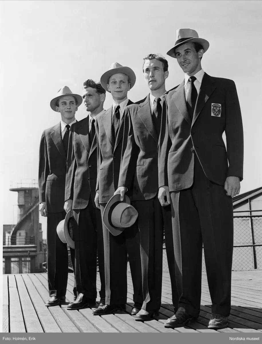 Foto på fem idrottsmän klädda i kostym. Nordiska Kompaniet.