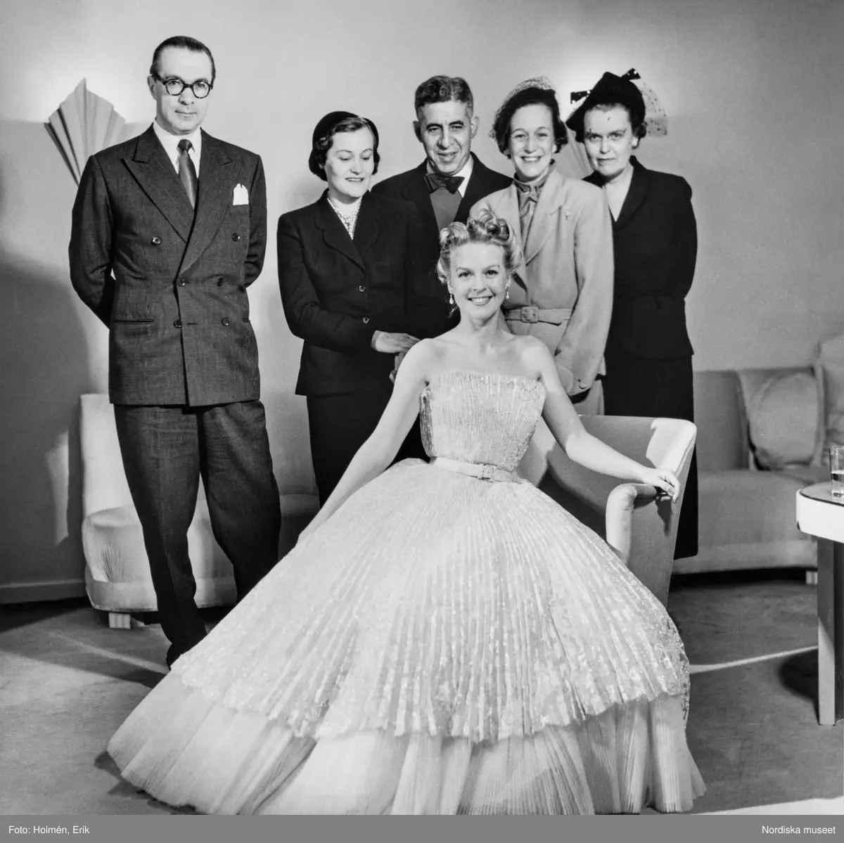 Friherrinnan Susanne Palmstierna poserar i den Diorklänning hon vunnit vid utlottning på NK:s Franska damskrädderi. Den ärmlösa klänningen har plisserat liv och kjol, midjan markerad med skärp. Underkjol av plisserad tyll. Bakom henne står juryn och till vänster en representant från Dior i Paris.