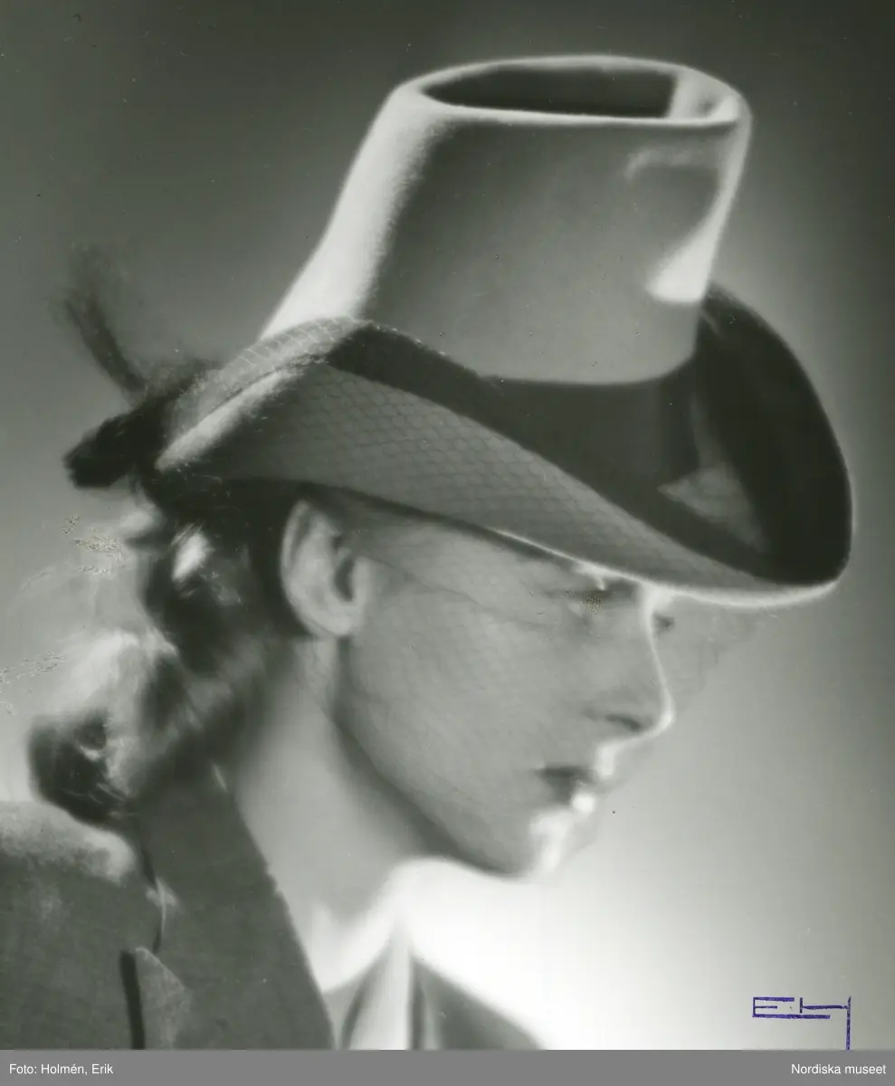 Porträtt av kvinna i hatt med flor och hattband av Cristóbal Balenciaga.