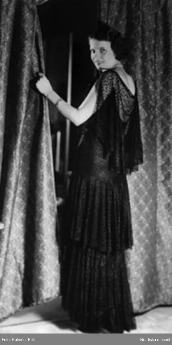 Kvinna i lång klänning. Jean Patou, Röd spets. Nordiska Kompaniet.