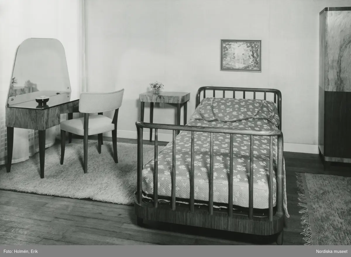 Möbelutställning på Nordiska Kompaniet, "Vackra möbler" maj 1937. Sovrumsmöblemang formgivet av Axel Einar Hjort. Säng, sängbord, toalettbord, stol.