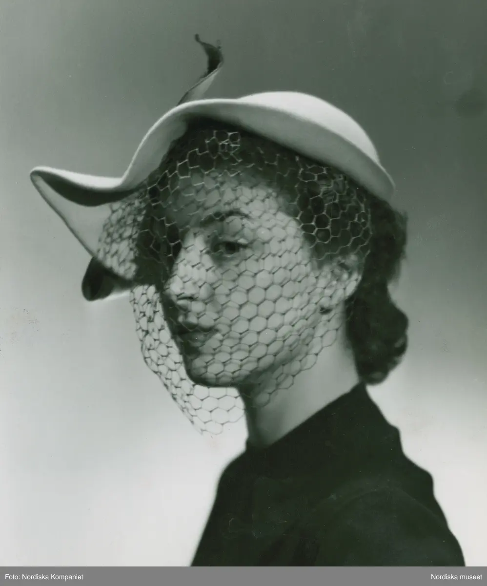 Porträtt av modell i naturfärgad filthatt med brun rosett och flor. Av Jacques Fath.