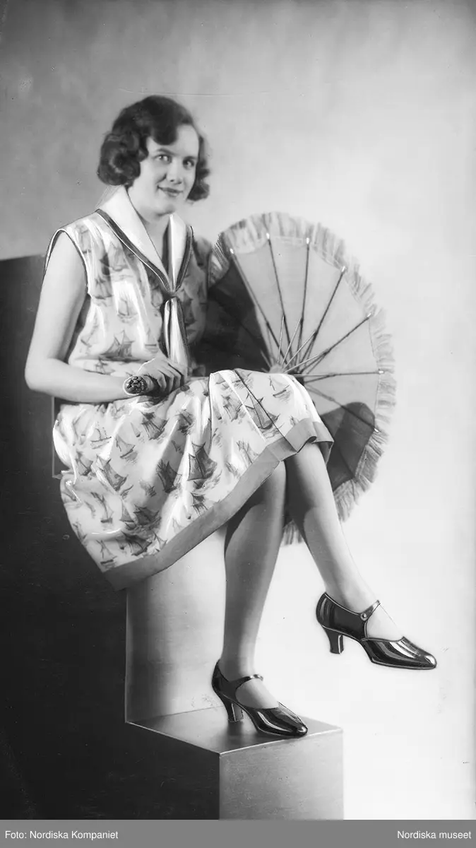 Sittande modell i klänning med "segelbåtsmönster" scarf och paraply i handen.