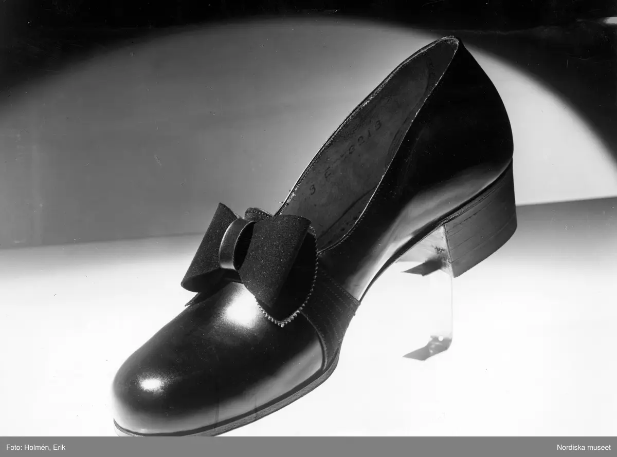 "En lätt tonårssko av svart skinn med liten rosett och utsmyckning av svart mocca. Från A.F Carlsson Vänersborg."