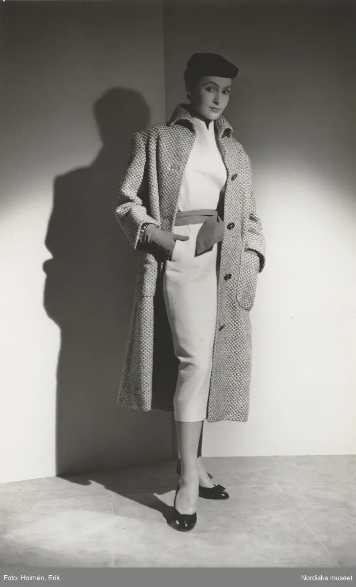 Modell i klänning med band i midjan, hatt och kappa. Från M. de Rauch.