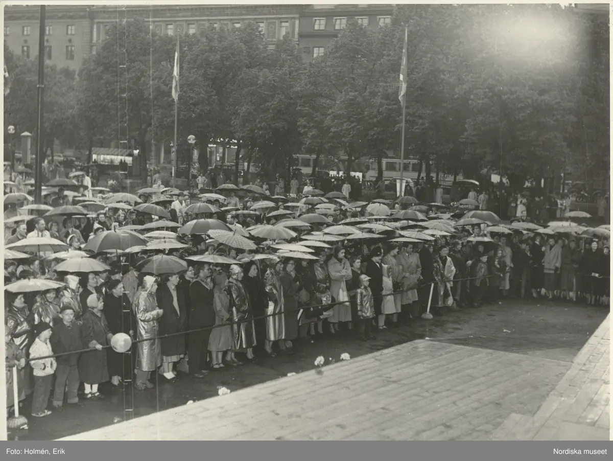 Tonårsmode visas i Kungsträdgården i Stockholm, Nordiska Kompaniet. Publik med paraplyer.