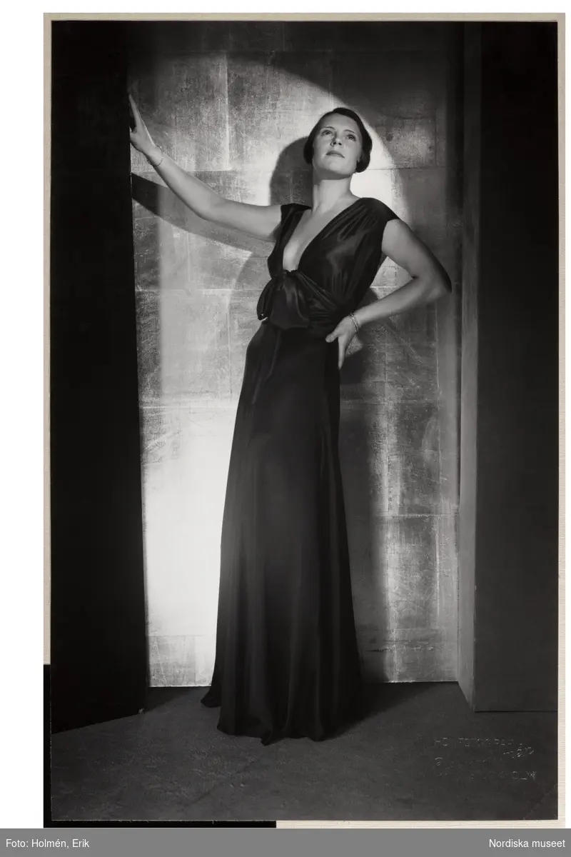 Mannekäng visar mode. Festklänning med kort ärm och djup urringning. Drapering och rosett nedanför bysten. Hellång kjol, snäv upptill och något vidare nedtill. NK:s Franska damskrädderi, från Madeleine Vionnet.