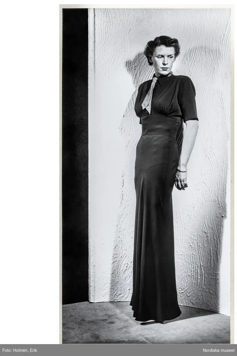 Mannekäng visar festklänning. Liv med krage, knuten scarf i avvikande färg, armbågslång ärm. Figurnära, hellång kjol med gångveck. NK:s Franska damskrädderi, från Marcel Rochas.